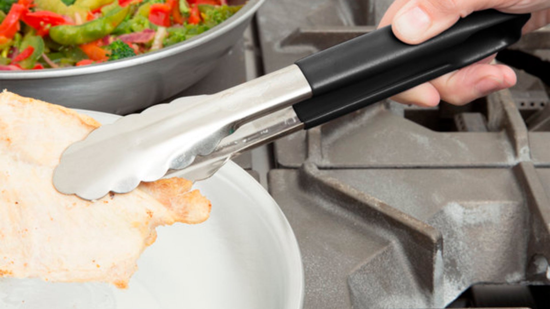 ¡Los utensilios codificados por colores, como estas pinzas, reducen el riesgo de enfermedades transmitidas por los alimentos debido a la...