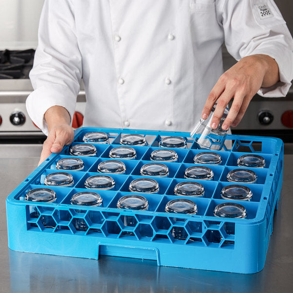¡Agilice el lavado de su cristalería con el estante para vasos Carlisle RG2514 OptiClean de 25 compartimentos! Fabricado con un material de polipropileno reforzado, este portavasos es resistente y duradero, ideal para años de uso intensivo. El apilamiento positivo desde cualquier dirección hace que este portavasos sea compatible con todos los principales competidores. La superficie texturizada resiste los rasguños para mantener sus estantes como nuevos, al tiempo que proporciona un agarre seguro. La superficie texturizada, junto con las manijas Comfort Curve que no pellizcarán los dedos, permite que su personal lo transporte fácilmente. Lo mejor de todo es que las manijas están moldeadas en los cuatro lados, para una carga sencilla en la máquina lavaplatos, sin necesidad de rotar las rejillas.