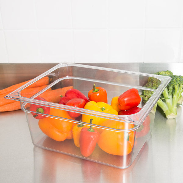 Mantenga los alimentos frescos por más tiempo con este recipiente transparente para alimentos de Carlisle. Esta bandeja para alimentos está hecha de policarbonato transparente y duradero con un acabado interior liso. Las esquinas superiores e inferiores reforzadas ofrecen soporte adicional y mayor resistencia contra roturas y deformaciones, mientras que un fondo que se puede colocar con una cuchara agrega rigidez estructural y facilita el acceso a los contenidos internos.