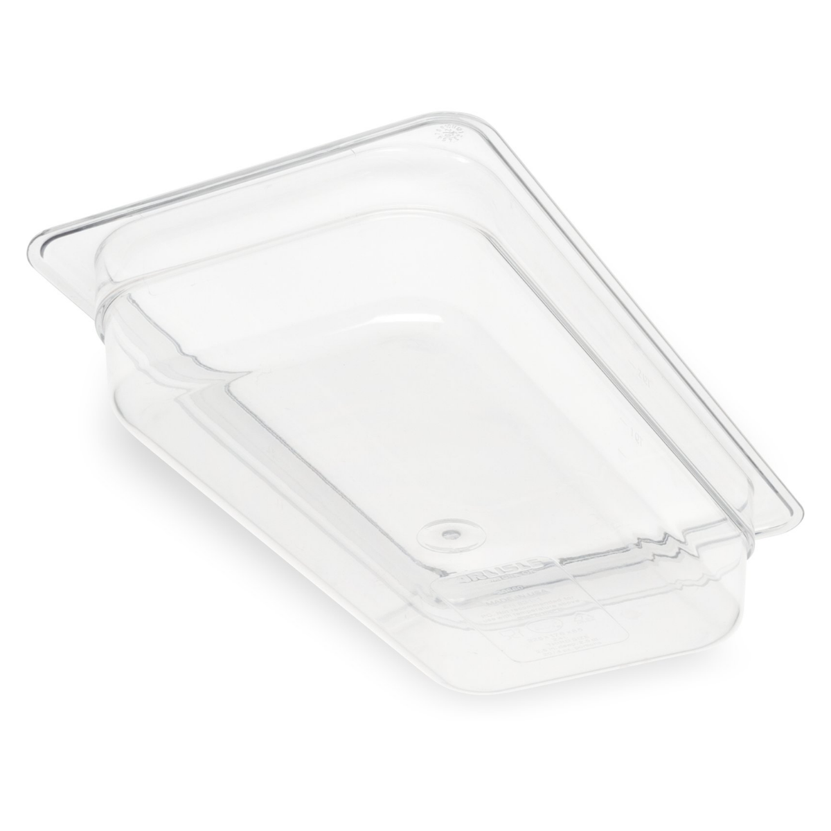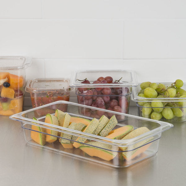 Mantenga los alimentos frescos por más tiempo con este recipiente transparente para alimentos de Carlisle. Esta bandeja para alimentos está hecha de policarbonato transparente y duradero con un acabado interior liso. Las esquinas superiores e inferiores reforzadas ofrecen soporte adicional y mayor resistencia contra roturas y deformaciones, mientras que un fondo que se puede colocar con una cuchara agrega rigidez estructural y facilita el acceso a los contenidos internos.