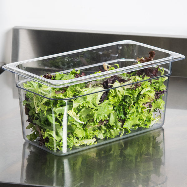 Mantenga los alimentos frescos por más tiempo con este recipiente transparente para alimentos de Carlisle. Esta bandeja para alimentos está hecha de policarbonato transparente y duradero con un acabado interior liso. Las esquinas superiores e inferiores reforzadas ofrecen soporte adicional y mayor resistencia contra roturas y deformaciones, mientras que un fondo que se puede colocar con una cuchara agrega rigidez estructural y facilita el acceso a los contenidos internos.